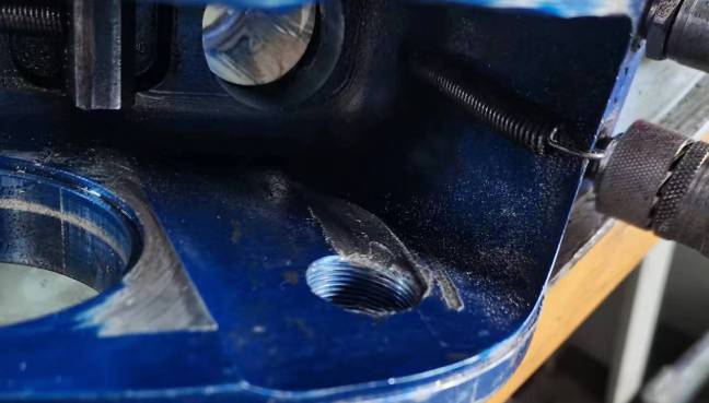 我們拆解檢查發(fā)現(xiàn),改扳手的兩側(cè)驅(qū)動(dòng)板在同一位置發(fā)生斷裂,油缸外沿刮擦缺損嚴(yán)重,殼體內(nèi)腔出現(xiàn)嚴(yán)重刮削凹痕,整個(gè)扳手內(nèi)部充滿金屬碎屑。從各部位損傷跡象我們可以推導(dǎo)出最先出現(xiàn)問(wèn)題的應(yīng)該是驅(qū)動(dòng)板。長(zhǎng)期高負(fù)荷運(yùn)行或者使用過(guò)程中的受力不均導(dǎo)致液壓扳手驅(qū)動(dòng)板出現(xiàn)損傷,但彼時(shí)并沒(méi)有達(dá)到非常嚴(yán)重的斷裂,扳手有些微卡但依然能夠轉(zhuǎn)動(dòng)使用,導(dǎo)致操作人員沒(méi)有及時(shí)發(fā)現(xiàn)和處理。但這個(gè)時(shí)候裂痕使得驅(qū)動(dòng)板不再光滑,并與殼體及油缸外沿產(chǎn)生接觸和刮削嚴(yán)重?fù)p傷了油缸和殼體。同時(shí),刮擦下來(lái)的金屬碎屑又在運(yùn)動(dòng)中進(jìn)入棘輪棘爪,對(duì)棘輪棘爪也造成了不小傷害。本來(lái)只用更換驅(qū)動(dòng)板,卻差點(diǎn)毀了整個(gè)扳手。