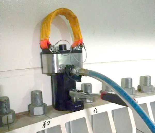 液壓拉伸器通過(guò)泵站壓力表實(shí)現(xiàn)精確的定值緊固,同步分流閥的設(shè)計(jì)使得一個(gè)泵站能同時(shí)驅(qū)動(dòng)多個(gè)液壓拉伸器對(duì)多個(gè)螺栓進(jìn)行同步拉伸,從而確保所有螺栓同時(shí)達(dá)到預(yù)定的載荷值。